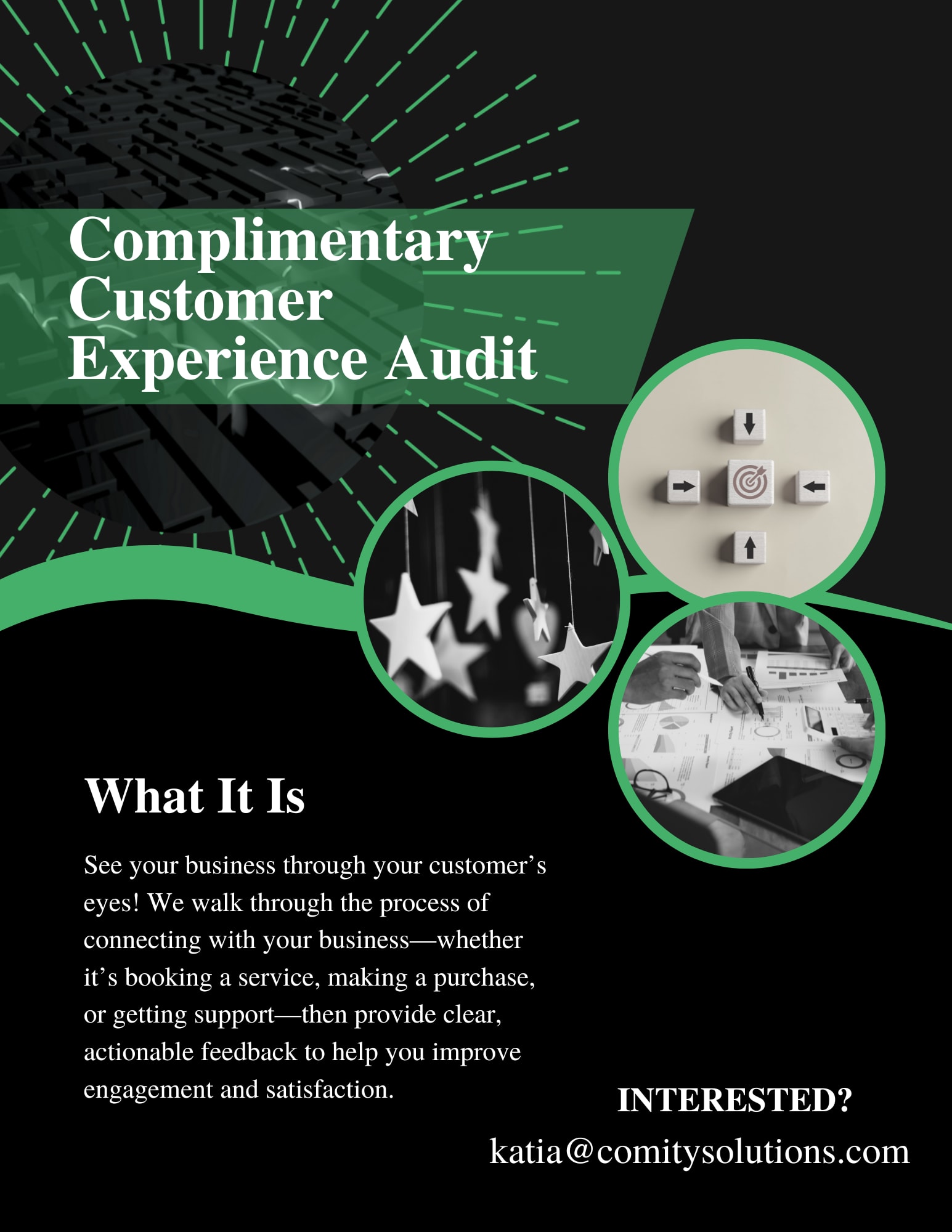 See your business through your customer’s eyes! We walk through the process of connecting with your business—whether it’s booking a service, making a purchase, or getting support—then provide clear, actionable feedback to help you improve engagement and satisfaction.